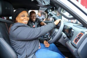 Kenya Power and Lighting Company (KPLC) Board Chairperson, Ms. Joy Masinde during a test drive on the BYD Shark 6 PHEV Truck. PHOTO/ Masinde.