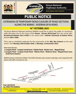 The Kenya National Highways Authority (KeNHA) has announced an extension of the temporary closure of a section of the Bomas–Kiserian (B19) Road to allow for scheduled roadworks.