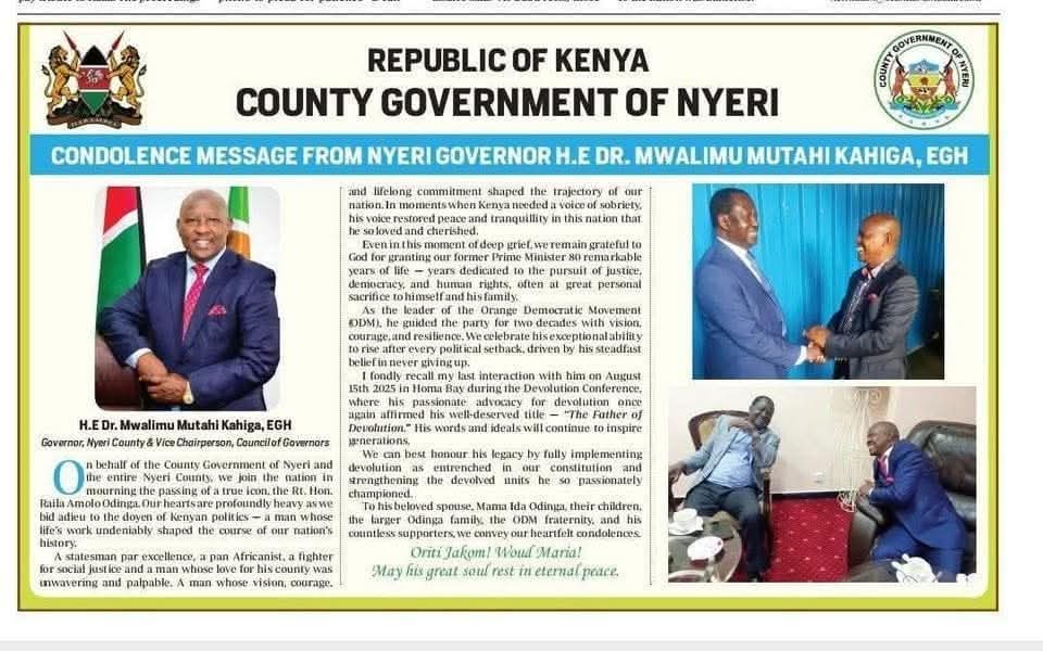 Nyeri Governor Mutahi Kahiga published almost half a page of a condolence message of the local dailies to former Prime Minister Raila Odinga.
