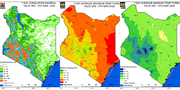 A photo collage showing the rainfall forecast and the maximum and minimum temperature forecasts for the period between March 17 and March 23. PHOTO/Kenya Met.