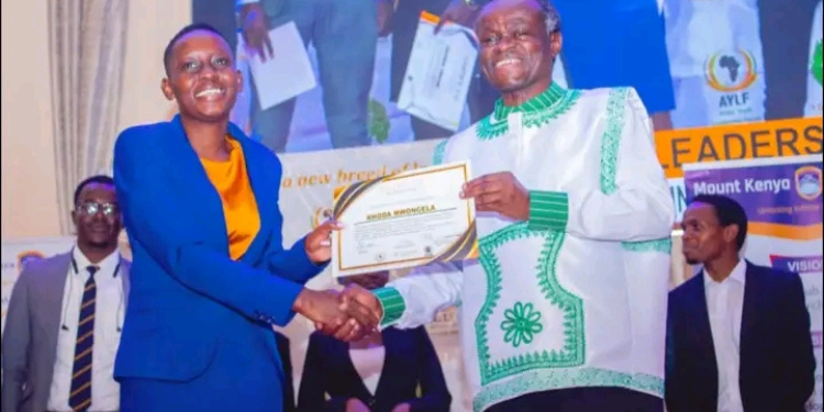 Professor P.L.O. Lumumba presents a certificate of recognition to mental health advocate Rhoda Mwongela “Bossbaby” during the AYLF Mount Kenya Leadership Summit at Mount Kenya University. PHOTO/ Courtsey