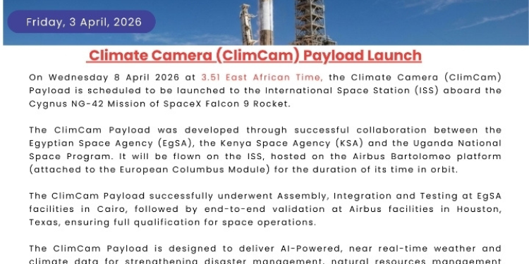The ClimCam is set to lift off on Wednesday, April 8, 2026, at 3:51 p.m. East African Time, aboard a SpaceX Falcon 9 rocket under the Cygnus NG-42 Mission from the Cape Canaveral Space Force Station in Florida.