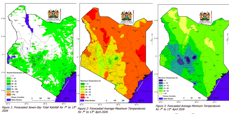 A photo collage showing the rainfall forecast and the maximum and minimum temperature forecasts for the period between April 7 and April 13. PHOTO/Kenya Met.