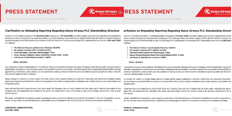 Kenya Airways clarifies its official shareholding structure to debunk misleading media reports. PHOTO/ Kenya Airways X