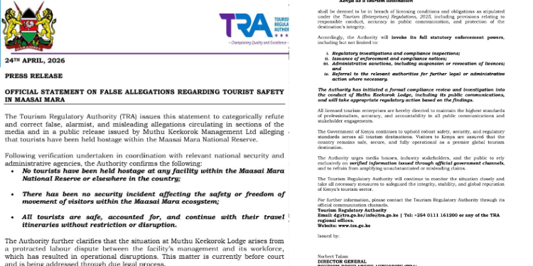 The Tourism Regulatory Authority (TRA) issued an official press release on April 24, 2026, to refute false claims of a hostage situation in the Maasai Mara by clarifying that a local labor dispute at Muthu Keekorok Lodge was misrepresented as a security crisis. PHOTO/ CS Rabecca Miano X.