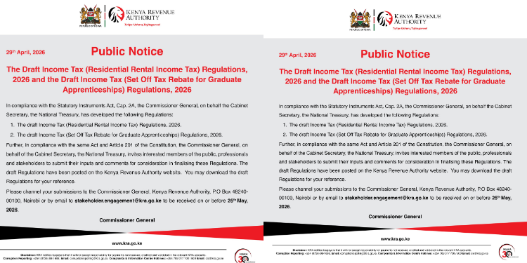 Kenya Revenue Authority invites Kenyans to submit views on proposed 2026 income tax regulations covering rental income and graduate apprenticeship tax rebates released on April 29, 2026. PHOTO/ KRA X